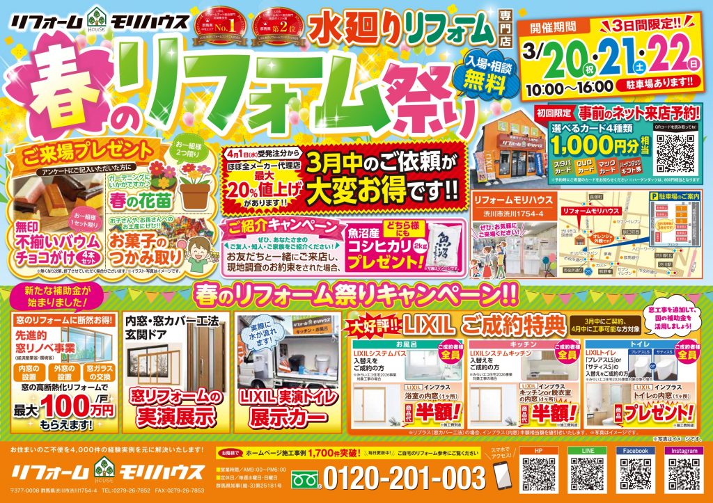 会場: リフォームモリハウス(渋川市渋川1754-4) ※駐車場完備・入場無料・相談無料です。