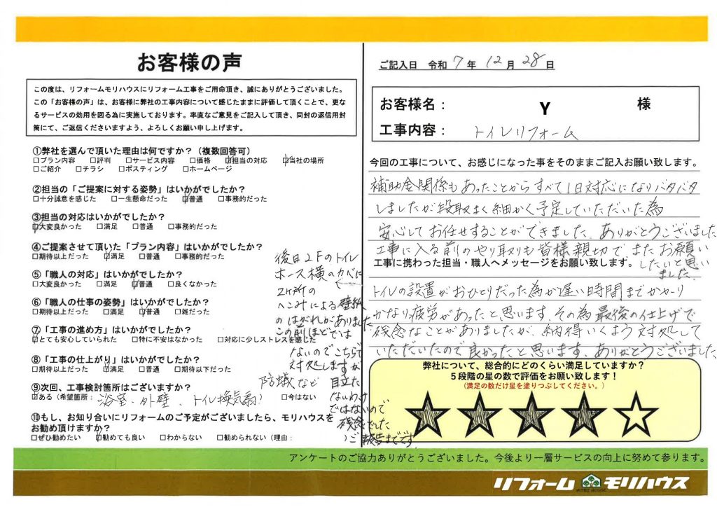 補助金関係もあったことからすべて1日対応になりバタバタしましたが段取りよく細かく予定していただいた為、安心してお任せすることができました。ありがとうございました。工事に入る前のやり取りも皆様親切で、またお願いしたいと思いました。トイレの設置がおひとりだった為か遅い時間までかかりかなり苦労があったと思います。その為最後の仕上げで残念なことがありましたが、納得いくよう対処していただいたので良かったと思います。ありがとうございました。(後日2Fのトイレホース横のカベに2ヶ所のへこみによる壁紙のはがれがありました。この前ほどではないのでこちらで対処しますが、目立たないわけではないので残念でした。ご報告までです。)
