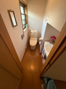 内装は便器の背面一部床が腐食していた為、下地の貼替をしフローリング溝を丁寧にパテ処理したのち、クッションフロアにて仕上させていただきました!