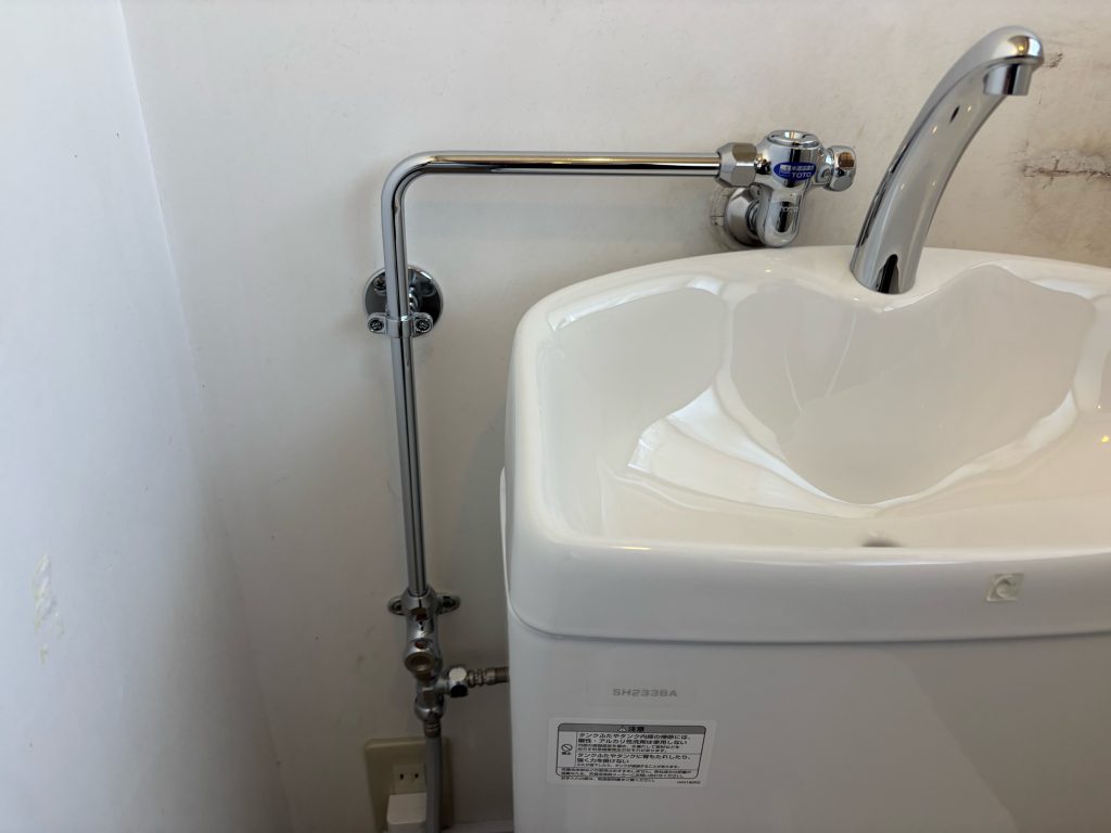 ・給排水管の位置変更: 隅付タンクと最新トイレでは給水管(止水栓)の位置が異なるため、配管を移設