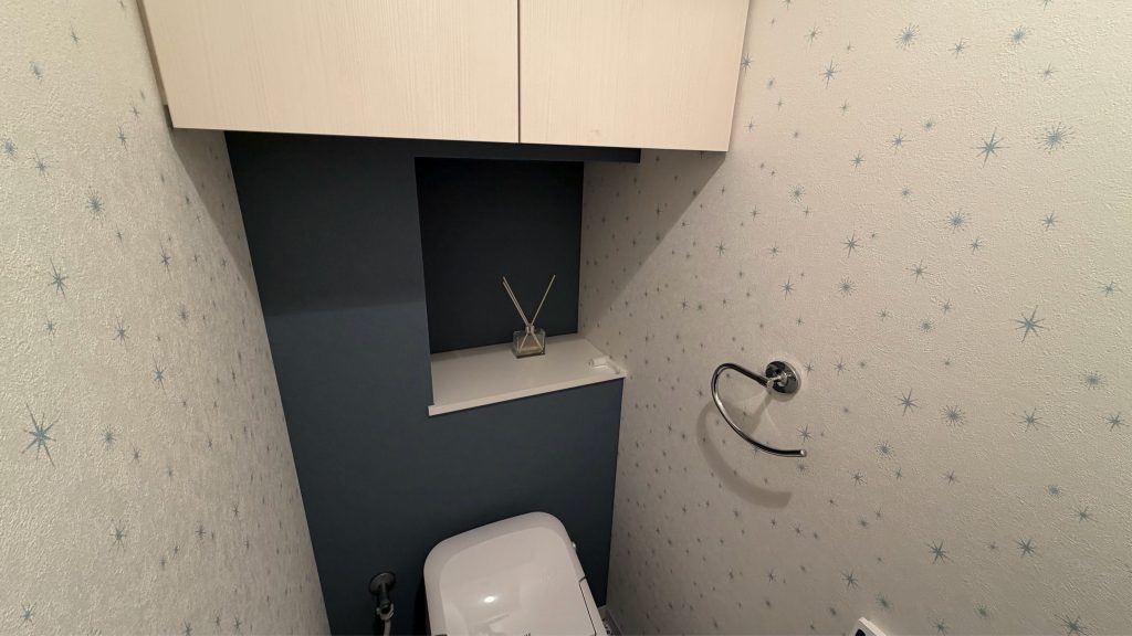 ★絶妙なアクセントクロス:奥一面だけを落ち着いたネイビーにすることで、空間に奥行きと高級感が生まれています。