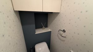 スッキリとしたフォルムのトイレを選ばれているので、限られたスペースがとても広く、モダンに見えます。
