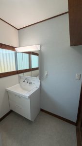 ★洗面台を設置する壁クロスをほんのりグレーのアクセントクロスを採用されていますので、落ち着いた印象に仕上がりました。