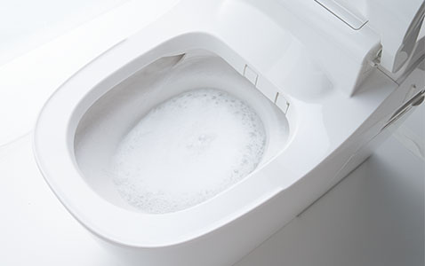 • 細かい泡が便器内をめぐり、おそうじします。市販の台所用合成洗剤(中性)を使用し、使用量は約3ヵ月で約250mL※1と少量です。※写真はL150シリーズです。